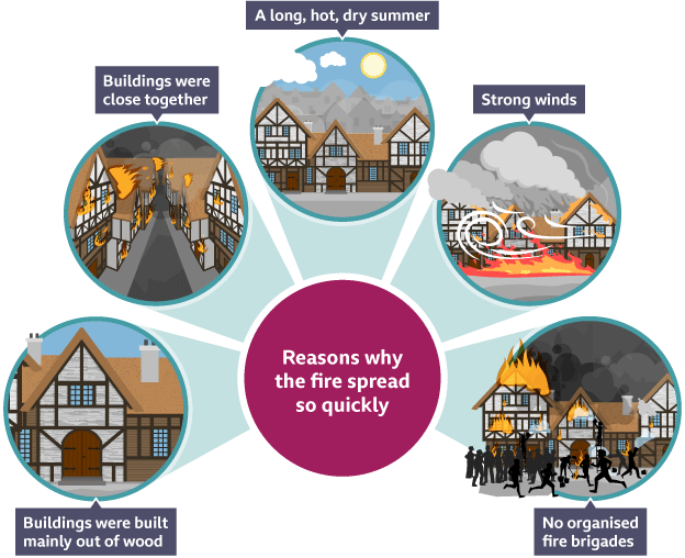 At that time, houses were made of wood and built very close together, so the fire spread quickly! There were strong winds that helped the Fames move from one house to another.